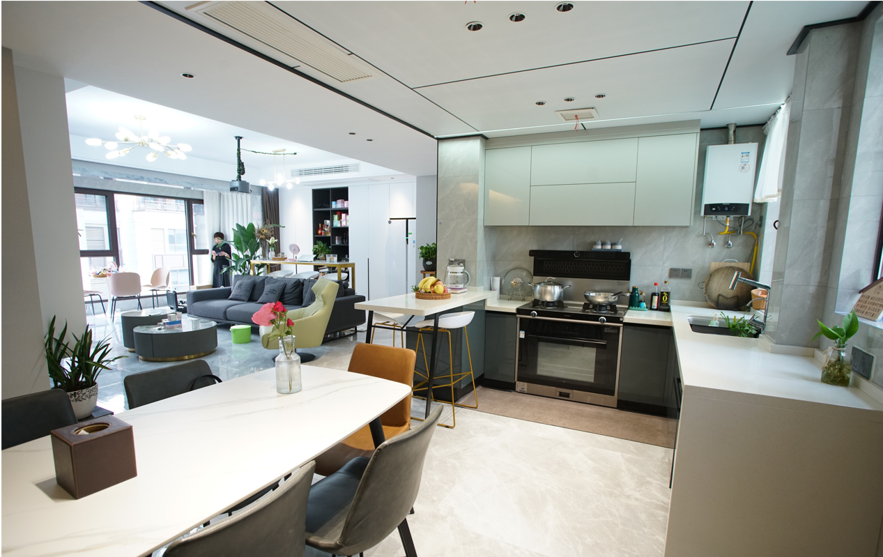 易女士家是開放式廚房,進(jìn)入家門第一眼看到的就是客廳和廚餐廳,整個(gè)空間是一體的。易女士說,“集成灶離餐桌1米左右,平時(shí)一家人坐在餐桌上吃飯,邊爆炒邊吃飯,一點(diǎn)油煙味兒都聞不到。”